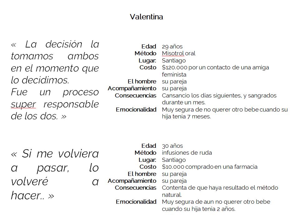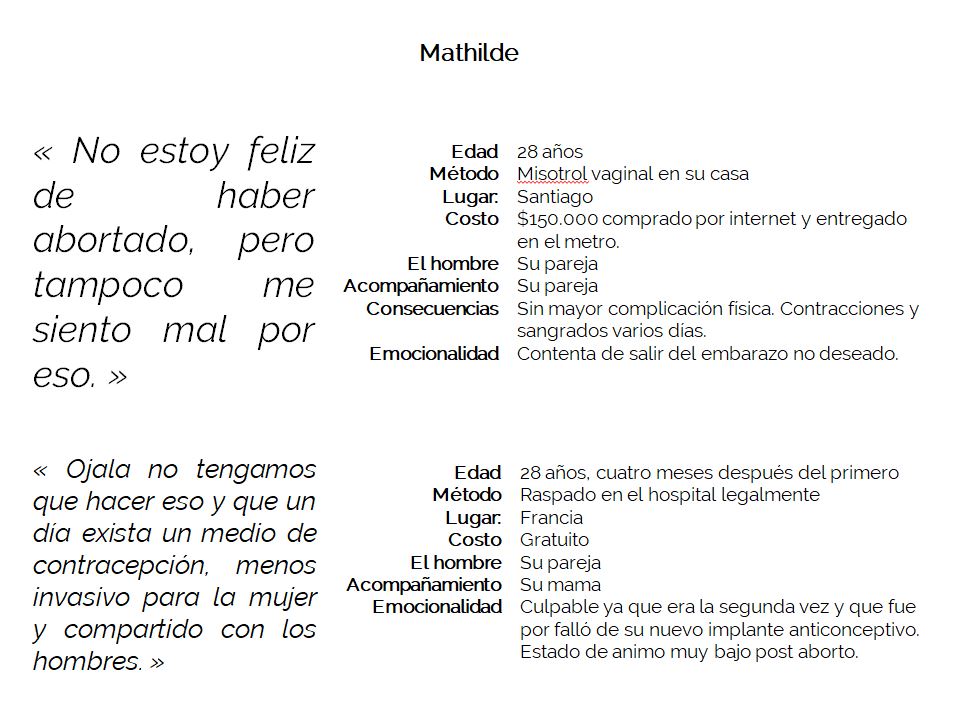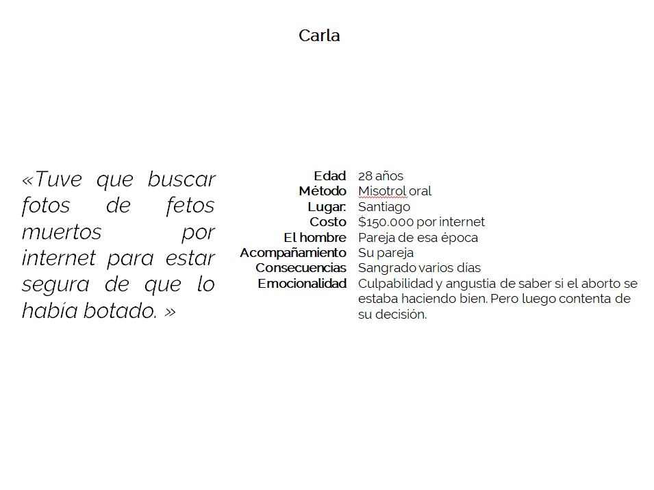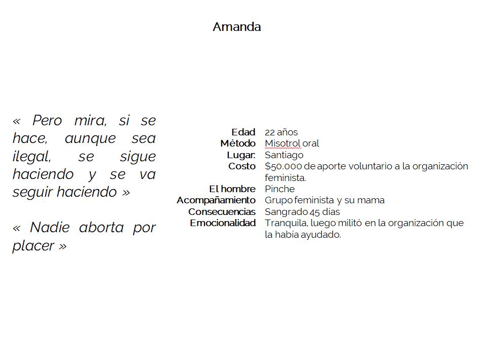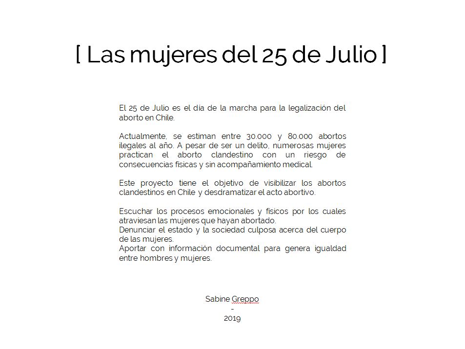 Ce projet a pour objectif de visibiliser les avortements clandestins au Chili. Il est composé d’images anonymes des femmes ayant avorté, ainsi qu’un podcast d’entretiens réalisés avec elles. Écouter les processus émotionnels et physiques par lesquels passent ses femmes. Dénoncer l’État et la société qui rend coupable les femmes ayant avorté. Apporter une information vraie sur ce phénomène afin de générer plus d’égalité entre les hommes et les femmes.